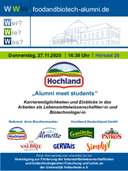 Alumni meet students: Berufsinformationsveranstaltung am Donnerstag, 27. November 2025 um 16:30 Uhr, im Hörsaal 26 mit Arno Brechenmacher, Senior Product Development Manager der Hochland Deutschland GmbH
